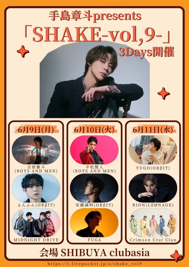 6月にDaysで開催される手島章斗 Presents「SHAKE~vol,9~」によんふん・安藤誠明・YUGOの出演が決定いたしました!