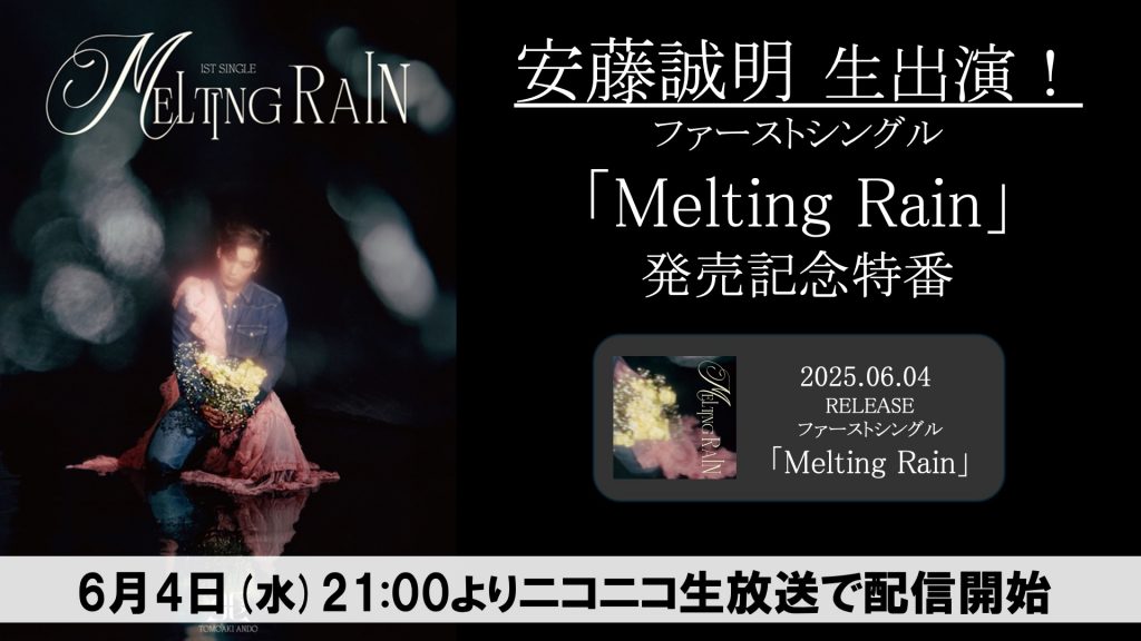 6月4日(水)安藤誠明 1st Single「Melting Rain」の発売を記念して、ニコニコ生放送にて特番が決定いたしました。
